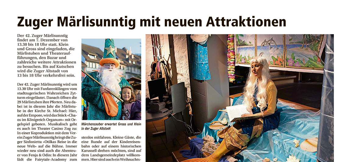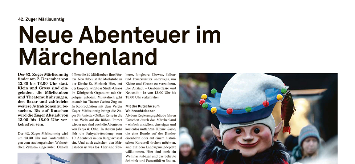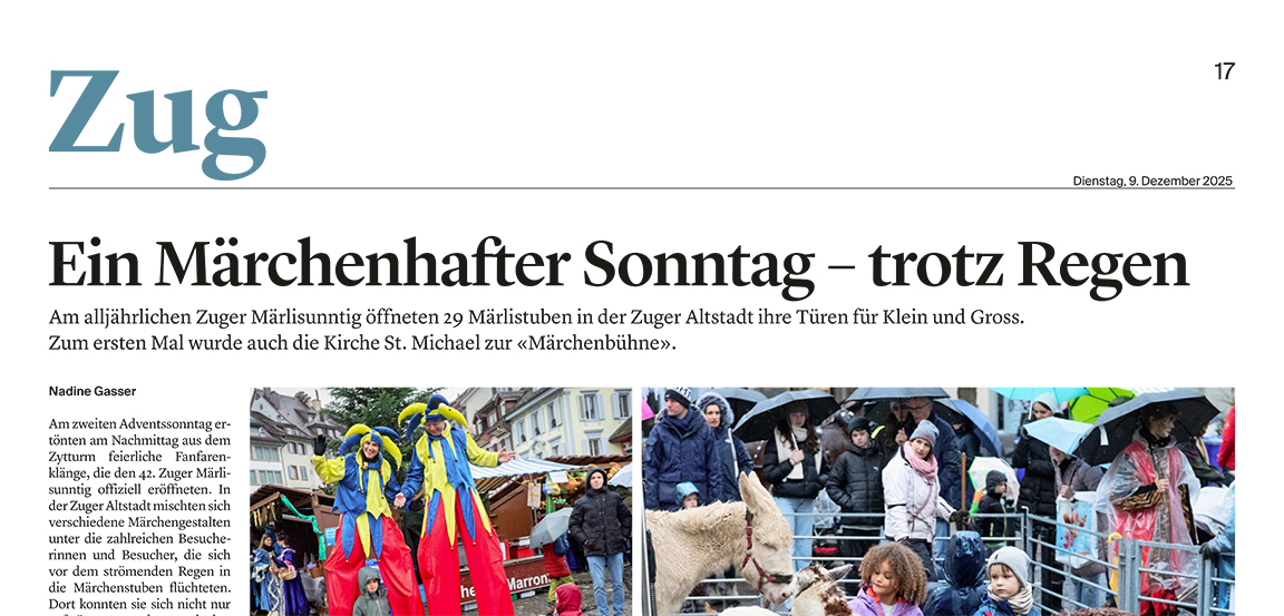 Am 7. Dezember 2025, von 13.30 bis 18.00 Uhr, lädt der Verein Zuger Märlisunntig erneut zu einem zauberhaften Nachmittag ins Märchenland ein. In der verkehrsfreien Zuger Altstadt werden rund 8’000 Gäste aus der Region und den umliegenden Kantonen erwartet, die sich vom Zauber des traditionellen, einzigartigen Zuger Märlisunntig einfangen lassen. Einen Nachmittag lang können Gross und Klein in die faszinierende Welt der Märchen eintauchen.